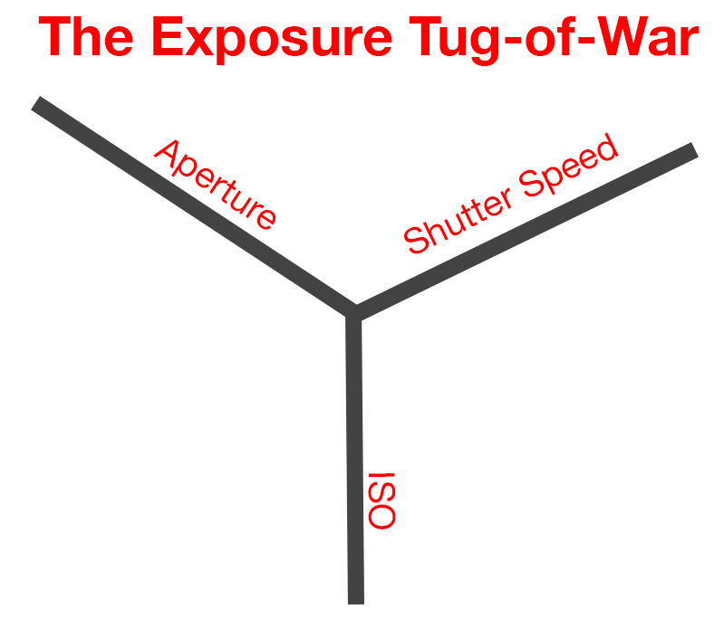 Many people describe exposure as a triangle. You may frequently be told to learn the “Exposure Triangle” and in some ways, this makes sense since the three values work together to contribute to the “proper” exposure value. We will discuss this in a bit. But I like to think of it as three strings tied together playing tug of war with the goal of keeping the knot in the center. If one side, say aperture pulls harder, the knot will slide out of the center. The other two strings have to pull back to get the knot back in the center.
